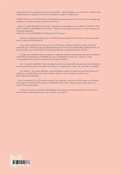J'ai décidé de rédiger ce manuel de manière à ce qu'il soit le moins technique possible, afin que tout le monde puisse l'utiliser. Sa compréhension est aisée, avec des mots simples, sans la nécessité de calculs compliqués...Je ne prends en compte que la date de naissance. Vous serez étonné.e de constater qu'elle possède une abondance d'informations à offrir, telle que : découvrir votre caractère, votre attitude envers autrui ou face aux aléas du temps, de connaître votre avenir. (Ainsi que celui de votre entourage !)Cette analyse vous aidera à surmonter les défis que l'existence nous impose, à mettre en lumière « force et faiblesse», et ainsi à mieux gérer le futur ! Chaque chiffre du destin vous renseignera sur :1/ses correspondances et ses attributs - ses tendances et les possibilités qu'elles offrent dans les 5 domaines principaux : amour, famille, travail, finances et santé. Les qualités et les défauts. 2/ Les 3 défis du chiffre du destin : les conseils pour les relever.3/ Ce que révèle " l'essence du chemin de vie ". Comment elle détermine votre caractère (les aspects positifs et négatifs).4/ L' interprétation du JOUR de naissance (et de son défi) révèle les traits dominants de votre personnalité, la manière dont votre entourage vous perçoit, l'image que vous projetez de vous-même... Cela s'applique également pour une meilleure connaissance d'autrui !5/ La méthode pour calculer votre année et votre mois personnels en tenant compte des 5 domaines principaux.6/ Pour vous faciliter la tâche, j'ai ajouté en fin de volume des fiches individuelles à remplir avec lesquelles vous pourrez toujours avoir à portée de main les nombres qui vous intéressent, sans avoir à réaliser en permanence des calculs. Elles vous seront très utiles, et ce, pour chaque personne pour laquelle vous souhaitez suivre son évolution...- En acquérant cette connaissance de soi, vous pourrez vous améliorer et devenir la personne que l'on a envie d'avoir comme ami.e. Vous saurez comment rectifier vos faiblesses et améliorer vos qualités...En utilisant plusieurs approches d'analyse, vous pourrez mieux comprendre, conseiller et guider les personnes qui vous entourent. Il vous faut simplement connaître leur date de naissance.Cette méthode simple mais judicieuse vous offrira un excellent moyen de réflexion pour vous soutenir dans vos divers projets et éclaircir vos préoccupations actuelles.Ce guide vous offrira une aide précieuse dans votre évolution personnelle.