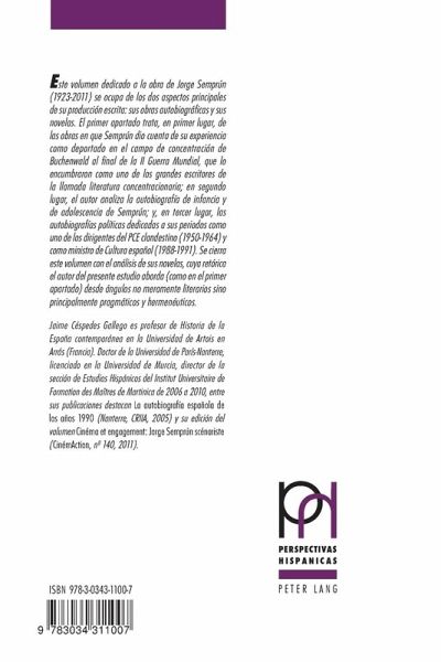 Este volumen dedicado a la obra de Jorge Semprún (1923-2011) se ocupa de los dos aspectos principales de su producción escrita: sus obras autobiográficas y sus novelas. El primer apartado trata, en primer lugar, de las obras en que Semprún dio cuenta de su experiencia como deportado en el campo de concentración de Buchenwald al final de la II Guerra Mundial, que lo encumbraron como uno de los grandes escritores de la llamada literatura concentracionaria; en segundo lugar, el autor analiza la autobiografía de infancia y de adolescencia de Semprún; y, en tercer lugar, las autobiografías políticas dedicadas a sus periodos como uno de los dirigentes del PCE clandestino (1950-1964) y como ministro de Cultura español (1988-1991). Se cierra este volumen con el análisis de sus novelas, cuya retórica el autor del presente estudio aborda (como en el primer apartado) desde ángulos no meramente literarios sino principalmente pragmáticos y hermenéuticos.