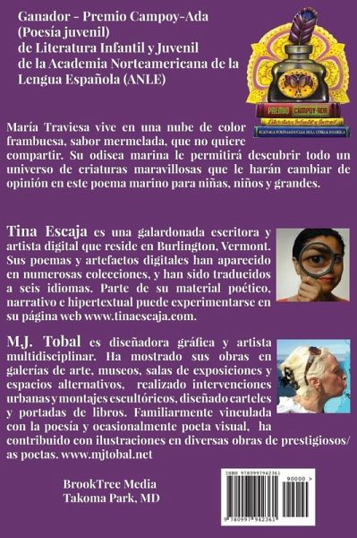 Ganador - Premio Campoy-Ada (Poesía juvenil) de Literatura Infantil y Juvenil de la Academia Norteamericana de la Lengua Española (ANLE) María Traviesa vive en una nube de color frambuesa, sabor mermelada, que no quiere compartir. Su odisea marina le permitirá descubrir todo un universo de criaturas maravillosas que le harán cambiar de opinión en este poema marino para niñas, niños y grandes. Winner-Campoy-Ada Award for Children's and Young People's Literature of the North American Academy of the Spanish Language (ANLE) Mischievous Mary lives in a cloud, the color of raspberry, the flavor of jam, which she doesn't want to share with anyone. Her nautical odyssey leads her to discover an entire universe of wonderful creatures that will help her to change her mind in this aquatic poem for girls, boys, and adults.