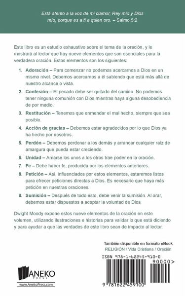 Está atento a la voz de mi clamor, Rey mío y Dios mío, porque es a ti a quien oro. - Salmo 5:2 Este libro es un estudio exhaustivo sobre el tema de la oración, y le mostrará al lector que hay nueve elementos que son esenciales para la verdadera oración. Estos elementos son los siguientes: Adoración - Para comenzar no podemos acercarnos a Dios en un mismo nivel. Debemos acercarnos a él sabiendo que está más allá de nuestro alcance o vista. Confesión - El pecado debe ser quitado del camino. No podemos tener ninguna comunión con Dios mientras haya alguna desobediencia de por medio. Restitución - Tenemos que enmendar el mal hecho, siempre que sea posible. Acción de gracias - Debemos estar agradecidos por lo que Dios ya ha hecho por nosotros. Perdón - Debemos perdonar a los demás y arrancar cualquier raíz de amargura que pueda estar creciendo. Unidad - Amarse los unos a los otros trae poder en la oración. Fe - Debe haber fe, producida por los elementos anteriores. Petición - Así, influenciados por estos elementos, estaremos listos para ofrecer peticiones directas a Dios. Es necesario que haya más petición en nuestras oraciones. Sumisión - Después de todo esto, debe venir la sumisión. Al orar, debemos estar dispuestos a aceptar la voluntad de Dios. Dwight Moody expone estos nueve elementos de la oración en este volumen, utilizando ilustraciones e historias para validar lo que está diciendo y para ayudar a que las verdades de este libro sean de impacto al lector.