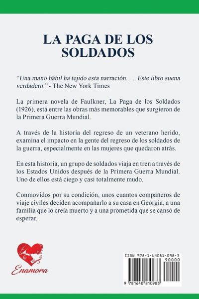"Una mano hábil ha tejido esta narración. . . Este libro suena verdadero." - The New York Times La primera novela de Faulkner, La Paga de los Soldados (1926), está entre las obras más memorables que surgieron de la Primera Guerra Mundial. A través de la historia del regreso de un veterano herido, examina el impacto en la gente del regreso de los soldados de la guerra, especialmente en las mujeres que quedaron atrás. En esta historia, un grupo de soldados viaja en tren a través de los Estados Unidos después de la Primera Guerra Mundial. Uno de ellos está ciego y casi totalmente mudo. Conmovidos por su condición, unos cuantos compañeros de viaje civiles deciden acompañarlo a su casa en Georgia, a una familia que lo creía muerto y a una prometida que se cansó de esperar.