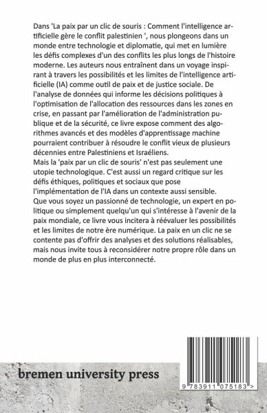 Dans 'La paix par un clic de souris : Comment l'intelligence artificielle gère le conflit palestinien ', nous plongeons dans un monde entre technologie et diplomatie, qui met en lumière les défis complexes d'un des conflits les plus longs de l'histoire moderne. Les auteurs nous entraînent dans un voyage inspirant à travers les possibilités et les limites de l'intelligence artificielle (IA) comme outil de paix et de justice sociale. De l'analyse de données qui informe les décisions politiques à l'optimisation de l'allocation des ressources dans les zones en crise, en passant par l'amélioration de l'administration publique et de la sécurité, ce livre expose comment des algorithmes avancés et des modèles d'apprentissage machine pourraient contribuer à résoudre le conflit vieux de plusieurs décennies entre Palestiniens et Israéliens. Mais la 'paix par un clic de souris' n'est pas seulement une utopie technologique. C'est aussi un regard critique sur les défis éthiques, politiques et sociaux que pose l'implémentation de l'IA dans un contexte aussi sensible. Que vous soyez un passionné de technologie, un expert en politique ou simplement quelqu'un qui s'intéresse à l'avenir de la paix mondiale, ce livre vous incitera à réévaluer les possibilités et les limites de notre ère numérique. La paix en un clic ne se contente pas d'offrir des analyses et des solutions réalisables, mais nous invite tous à reconsidérer notre propre rôle dans un monde de plus en plus interconnecté.