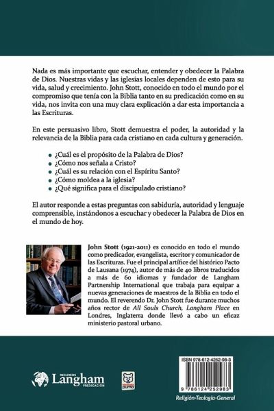 Nada es más importante que escuchar, entender y obedecer la Palabra de Dios. Nuestras vidas y las iglesias locales dependen de esto para su vida, salud y crecimiento. John Stott, conocido en todo el mundo por el compromiso que tenía con la Biblia tanto en su predicación como en su vida, nos invita con una muy clara explicación a dar esta importancia a las Escrituras. En este persuasivo libro, Stott demuestra el poder, la autoridad y la relevancia de la Biblia para cada cristiano en cada cultura y generación. ¿Cuál es el propósito de la Palabra de Dios? ¿Cómo nos señala a Cristo? ¿Cuál es su relación con el Espíritu Santo? ¿Cómo moldea a la iglesia? ¿Qué significa para el discipulado cristiano? El autor responde a estas preguntas con sabiduría, autoridad y lenguaje comprensible, instándonos a escuchar y obedecer la Palabra de Dios en el mundo de hoy.