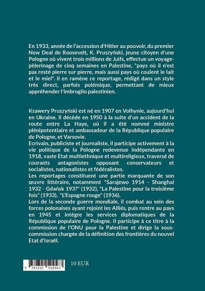 Ksawery Pruszynski est né en 1907 en Volhynie, aujourd'hui en Ukraine. Il décède en 1950 à la suite d'un accident de la route entre La Haye, où il a été nommé ministre plénipotentiaire et ambassadeur de la République populaire de Pologne, et Varsovie. Ecrivain, publiciste et journaliste, il participe activement à la vie politique de la Pologne redevenue indépendante en 1918, vaste Etat multiethnique et multireligieux, traversé de courants antagonistes opposant conservateurs et socialistes, nationalistes et fédéralistes. Les reportages constituent une partie marquante de son oeuvre littéraire, notamment "Sarajewo 1914 - Shanghai 1932 - Gdansk 193?" (1932), "La Palestine pour la troisième fois" (1933), "L'Espagne rouge" (1936). Lors de la seconde guerre mondiale, il combat au sein des forces polonaises ayant rejoint les Alliés, puis rentre au pays en1945 et intègre les services diplomatiques de la République populaire de Pologne. Il participe à ce titre à la commission de l'ONU pour la Palestine et dirige la sous-commission chargée de la définition des frontières du nouvel Etat d'Israël.