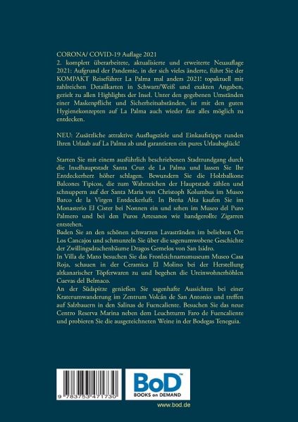CORONA/ COVID-19 Auflage 2021 2. komplett überarbeitete, aktualisierte und erweiterte Neuauflage 2021: Aufgrund der Pandemie, in der sich vieles änderte, führt Sie der KOMPAKT Reiseführer La Palma mal anders 2021! topaktuell mit zahlreichen Detailkarten in Schwarz/Weiß und exakten Angaben, gezielt zu allen Highlights der Insel. Unter den gegebenen Umständen einer Maskenpflicht und Sicherheitsabständen, ist mit den guten Hygienekonzepten auf La Palma auch wieder fast alles möglich zu entdecken. NEU: Zusätzliche attraktive Ausflugsziele und Einkaufstipps runden Ihren Urlaub auf La Palma ab und garantieren ein pures Urlaubsglück!Starten Sie mit einem ausführlich beschriebenen Stadtrundgang durch die Inselhauptstadt Santa Cruz de La Palma und lassen Sie Ihr Entdeckerherz höher schlagen. Bewundern Sie die Holzbalkone Balcones Tipicos, die zum Wahrzeichen der Hauptstadt zählen und schnuppern auf der Santa Maria von Christoph Kolumbus im Museo Barco de la Virgen Entdeckerluft. In Breña Alta kaufen Sie im Monasterio El Cister bei Nonnen ein und sehen im Museo del Puro Palmero und bei den Puros Artesanos wie handgerollte Zigarren entstehen. Baden Sie an den schönen schwarzen Lavastränden im beliebten Ort Los Cancajos und schmunzeln Sie über die sagenumwobene Geschichte der Zwillingsdrachenbäume Dragos Gemelos von San Isidro. In Villa de Mazo besuchen Sie das Fronleichnamsmuseum Museo Casa Roja, schauen in der Ceramica El Molino bei der Herstellung altkanarischer Töpferwaren zu und begehen die Ureinwohnerhöhlen Cuevas del Belmaco. An der Südspitze genießen Sie sagenhafte Aussichten bei einer Kraterumwanderung im Zentrum Volcán de San Antonio und treffen auf Salzbauern in den Salinas de Fuencaliente. Besuchen Sie das neue Centro Reserva Marina neben dem Leuchtturm Faro de Fuencaliente und probieren Sie die ausgezeichneten Weine in der Bodegas Teneguia. Unbedingt sollten Sie das Weinmuseum Casa Museo del Vino in Las Manchas anfahren, indem Sie alle Inselweine probieren und kaufen können. Das neu eröffnete Besucherzentrum Caños de Fuego erklärt Ihnen die frühsten Vulkanausbrüche auf La Palma. Verpassen Sie nicht eine geführte Tour durch die dunkle Vulkanhöhle zu buchen. Gehen Sie neben dem Museo del Plátano in eine Bananenplantage oder sichten Sie Delfine und Wale auf einem Bootstrip ab Puerto de Tazacorte. In El Paso besichtigen Sie das Seidenmuseum Museo de la Seda und sehen die Petroglyphen El Verde und La Fayana. Vom Centro de Visitantes de El Paso starte