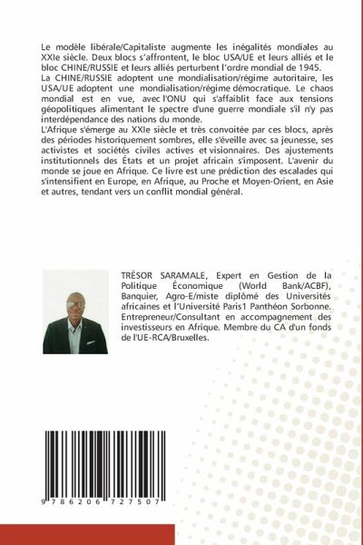 Le modèle libérale/Capitaliste augmente les inégalités mondiales au XXIe siècle. Deux blocs s'affrontent, le bloc USA/UE et leurs alliés et le bloc CHINE/RUSSIE et leurs alliés perturbent l'ordre mondial de 1945.La CHINE/RUSSIE adoptent une mondialisation/régime autoritaire, les USA/UE adoptent une mondialisation/régime démocratique. Le chaos mondial est en vue, avec l'ONU qui s'affaiblit face aux tensions géopolitiques alimentant le spectre d'une guerre mondiale s'il n'y pas interdépendance des nations du monde.L'Afrique s'émerge au XXIe siècle et très convoitée par ces blocs, après des périodes historiquement sombres, elle s'éveille avec sa jeunesse, ses activistes et sociétés civiles actives et visionnaires. Des ajustements institutionnels des États et un projet africain s'imposent. L'avenir du monde se joue en Afrique. Ce livre est une prédiction des escalades qui s'intensifient en Europe, en Afrique, au Proche et Moyen-Orient, en Asie et autres, tendant vers un conflit mondial général.
