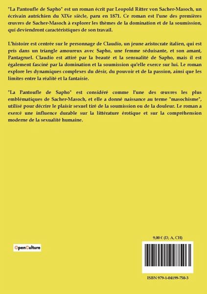"La Pantoufle de Sapho" est un roman écrit par Leopold Ritter von Sacher-Masoch, un écrivain autrichien du XIXe siècle, paru en 1871. Ce roman est l'une des premières ¿uvres de Sacher-Masoch à explorer les thèmes de la domination et de la soumission, qui deviendront caractéristiques de son travail. L'histoire est centrée sur le personnage de Claudio, un jeune aristocrate italien, qui est pris dans un triangle amoureux avec Sapho, une femme séduisante, et son amant, Pantagruel. Claudio est attiré par la beauté et la sensualité de Sapho, mais il est également fasciné par la domination et la soumission qu'elle exerce sur lui. Le roman explore les dynamiques complexes du désir, du pouvoir et de la passion, ainsi que les limites entre la réalité et la fantaisie. "La Pantoufle de Sapho" est considéré comme l'une des ¿uvres les plus emblématiques de Sacher-Masoch, et elle a donné naissance au terme "masochisme", utilisé pour décrire le plaisir sexuel tiré de la soumission ou de la douleur. Le roman a exercé une influence durable sur la littérature érotique et sur la compréhension moderne de la sexualité humaine.