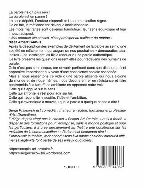La parole ne dit plus rien !La parole est en panne !Le sens dépérit, l'orateur disparaît et la communication règne.De ce fait, la méfiance est devenue institutionnelle.Les mots maltraités sont devenus frauduleux, leur sens équivoque et leur impact suspect.« Mal nommer les choses, c'est participer au malheur du monde » disait Albert Camus.Après la description des exemples de délitement de la parole au sein d'une société en relâchement, qui augure de nos prochaines « démocraties totalitaires », se dessinent les fils à renouer d'une parole authentique.Ce livre présente les questions essentielles pour redevenir des humains de parole.Cela n'est pas sans risque, car devenir pertinent dans son discours, c'est apparaître impertinent aux yeux d'une conscience sociale aseptisée.Mais si nous ressentons ce vide d'une parole absente qui nous éloigne du monde et de nous-mêmes, nous devons entrer en résistance et faire contrepoids à la tartufferie ambiante en opposant notre voix.Celle qui s'appuie sur le sens.Celle qui affronte le réel pour agir sur lui.Celle qui réconcilie le souffle, l'idée et l'ambition.Celle qui revendique à nouveau que la parole a quelque chose à dire !