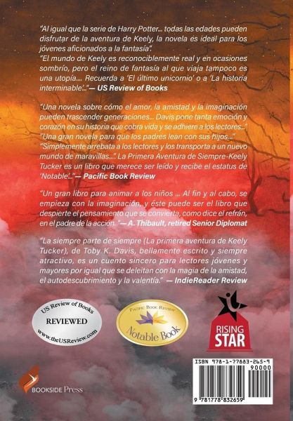 Keely Rosalie Tucker, de diez años, es una moderna heroína sin armadura. Constantemente acosada por un niño vecino, Keely lucha por encontrar su lugar en el mundo en el que sólo la consuelan las historias que su abuelita le ha contado sobre lugares encantados y lejanos, donde unicornios, hadas y ángeles protegen a los niños de los dolores y peligros cotidianos de la vida. Ahora todo lo que Keely tiene que hacer es averiguar cómo llamarlos para que la ayuden. Todo cambia cuando su querida abuela muere repentinamente y le regala a Keely su viejo caballo, Mariah, preparando el terreno para una aventura. Keely descubre que Mariah puede hablar, y pronto encuentra el camino a un valle oculto sobre la luna y más allá del arco iris donde monstruos y dragones perturban e invaden la paz de la mente. Ahora debe aprender a creer en sí misma y desarrollar sus poderes secretos para conseguir un milagro antes de que sea demasiado tarde. En este encantador cuento de fantasía, una niña aprende a armarse de valor y a confiar en su imaginación mientras abre su corazón y su mente a los sonidos de lo posible en un último esfuerzo por salvar a una amiga. "Al igual que la serie de Harry Potter... todas las edades pueden disfrutar de la aventura de Keely, la novela es ideal para los jóvenes aficionados a la fantasía". "El mundo de Keely es reconociblemente real y en ocasiones sombrío, pero el reino de fantasía al que viaja tampoco es una utopía.... Recuerda a 'El último unicornio' o a 'La historia interminable'..."- US Review of Books "Una novela sobre cómo el amor, la amistad y la imaginación pueden trascender generaciones... Davis pone tanta emoción y corazón en su historia que cobra vida y se adhiere a los lectores..." "Una gran novela para que los padres lean con sus hijos..." "Simplemente arrebata a los lectores y los transporta a un nuevo mundo de maravillas...". La Primera Aventura de Siempre-Keely Tucker es un libro que merece ser leído y recibe el estatus de 'Notable'..."- Pacific Book Review "Un gran libro para animar a los niños ... Al fin y al cabo, se empieza con la imaginación, y éste puede ser el libro que despierte el pensamiento que se convierta, como dice el refrán, en el padre de la acción". "La siempre parte de siempre (La primera aventura de Keely Tucker), de Toby K. Davis, bellamente escrito y siempre atractivo, es un cuento sincero para lectores jóvenes y mayores por igual que se deleitan con la magia de la amistad, el autodescubrimiento y la valentía." - Reseña de IndieReader "La parte eternamente eterna" es una creativa novela de grado medio que convierte lo ordinario en extraordinario". - Hollywood Book Reviews