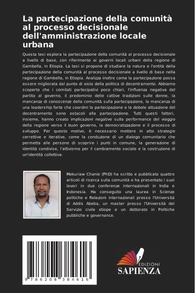 Questa tesi esplora la partecipazione della comunità al processo decisionale a livello di base, con riferimento ai governi locali urbani della regione di Gambella, in Etiopia. La tesi si propone di studiare la natura e l'entità della partecipazione della comunità al processo decisionale a livello di base nella regione di Gambella, in Etiopia. Analizza inoltre come la partecipazione possa essere migliorata dal punto di vista della politica di decentramento. Abbiamo scoperto che i comitati partecipativi poco chiari, l'influenza negativa del partito al governo, il predominio delle cattive tradizioni sulle donne, la mancanza di conoscenze della comunità sulla partecipazione, la mancanza di una leadership forte che coordini la partecipazione e la debole attuazione del decentramento sono ostacoli alla partecipazione. Tutti questi fattori, insieme, hanno creato implicazioni negative sulla performance del viaggio della regione verso il buon governo, la democratizzazione e il processo di sviluppo. Per questo motivo, è necessario mettere in atto strategie correttive e iterative, come la conduzione di un dialogo comunitario che permetta alle persone di scoprire i punti in comune, la generazione di identità condivise, l'attivismo per il cambiamento sociale e la costruzione di un'identità collettiva.