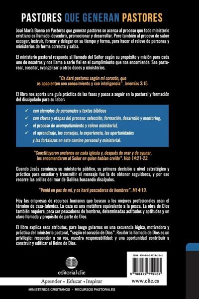 Un libro que nos inspira a ser inquebrantables en cumplir la misi¿¿n encomendada, ya sea pastoreando, ense¿¿ando, evangelizando o ejerciendo otros dones y ministerios. Pastores que generan pastores se acerca al proceso que todo ministerio cristiano es llamado a crecer, desarrollarse y multiplicarse. Tambi¿¿n aborda el proceso de saber escoger, instruir, formar, delegar y, en su tiempo, hacer el relevo de personas y ministerios de una forma correcta y sabia. A lo largo de este libro, exploramos c¿¿mo el principio de multiplicaci¿¿n divina, instaurado desde la creaci¿¿n, fluye en el proceso y crecimiento de su labor para nutrir el desarrollo del ministerio cristiano. Y con ello saber transmitir un legado y responsabilidad haciendo el relevo con conocimiento e inteligencia y, sobre todo, con un coraz¿¿n de Dios. En este libro, el reconocido pastor y profesor Jos¿¿ Mar¿¿a Baena nos da una gu¿¿a pr¿¿ctica de las fases y pasos a seguir en la forma pastoral y formaci¿¿n de otros pastores con: Los ejemplos de personajes y textos b¿¿blicos que nos dan las claves o gu¿¿as Las etapas o fases del proceso: selecci¿¿n, formaci¿¿n, desarrollo Mentoring, acompä¿amiento y relevo ministerial Recibir la llamada de Dios es un privilegio e implica responder a su voz, aceptar nuestra responsabilidad y aprovecharse de la oportunidad de contribuir a construir y edificar el reino de Dios en la iglesia, ministerios, familias, personas, almas, y seguramente, el de nuestras propias vidas, para que no sean en vano. "Os dar¿¿ pastores seg¿¿n mi coraz¿¿n, que os apacienten con conocimiento y con inteligencia" (Jerem¿¿as 3:15). Pastors Who Generate Pastors A book that passionately inspires us to stand unwavering in fulfilling the entrusted mission, whether it's shepherding, teaching, evangelizing, or engaging in other types of ministries. Pastors Who Generate Pastors delves into the process that every Christian ministry is called to grow, develop, and multiply. It also addresses the process of knowing how to select, instruct, train, delegate, and, in due time and manner, make the transition of responsibilities and ministries in a correct and wise manner. Throughout this book, we explore how the principle of divine multiplication, established since creation, flows within the process and growth of His work to nurture the development of Christian ministry. In doing so, we learn to transmit a legacy and responsibility by making the transition with knowledge and intelligence, and above all, with the heart of God. In this book, the renowned pastor and professor Jos¿¿ Mar¿¿a Baena Acebal provides us with a practical guide to the phases and steps to follow in pastoral formation and the training of other pastors, including: Examples from key characters and biblical texts that offer key insights and guidance The stages or phases of the process: selection, training, development Mentoring, support, and ministerial succession Receiving God's call is a privilege; responding to His voice is our responsibility and an opportunity to contribute to building and edifying the Kingdom of God in the church, ministries, families, individuals, souls, and, undoubtedly, our own lives, so that they are not in vain. "Then I will give you shepherds after my own heart, who will lead you with knowledge and understanding." Jeremias 3:15