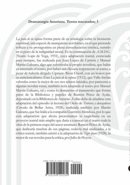 'La pata de la raposa' (1912) forma parte de su tetralogía sobre la biometría espiritual, una especie de anarquismo acrobático, en el que pretende reflejar a su protagonista en plena autoeducación estética, sumido en el pozo de la indignidad moral. Es la continuación teatral de 'A.M.D.G.' (1931), adaptación teatral extraviada, realizada por López de Carrión y Martín Galeano, algo que ruborizaba al propio novelista, que había ya intentado el teatro, a pesar de dirigirla Cipriano Rivas Cherif. Esta obra, que Valle-Inclán valoraba como la mejor de sus tres relatos iniciales, por parecerse a algunas novelas rusas, también sería adaptada al teatro por Manuel Martín Galeano. A ellas debe de añadirse otra adaptación de un episodio de 'Troteras y danzaderas' (1928),por lo que esta adaptación se englobaría en un proyecto teatral sobre toda la obra de esta etapa de Pérez de Ayala, que se dedicaría a la crítica teatral, también asistió a la adaptación de 'Tigre Juan' (1928), por Julio de Hoyos.