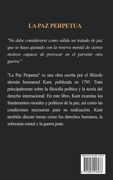 "No debe considerarse como válido un tratado de paz que se haya ajustado con la reserva mental de ciertos motivos capaces de provocar en el porvenir otra guerra." "La Paz Perpetua" es una obra escrita por el filósofo alemán Immanuel Kant, publicada en 1795. Trata principalmente sobre la filosofía política y la teoría del derecho internacional. En este libro, Kant examina los fundamentos morales y políticos de la paz, así como las condiciones necesarias para su realización. Kant también discute temas como los derechos humanos, la soberanía estatal y la guerra justa.