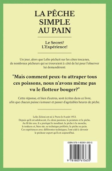 Un jour, alors que Lelio pêchait sur les côtes toscanes, de nombreux pêcheurs qui se trouvaient à côté de lui pour l'observer lui demandèrent: "Mais comment peux-tu attraper tous ces poissons, nous n'avons même pas vu le flotteur bouger?" Cette réponse, et bien d'autres, sont écrites dans ce livre, afin que chacun puisse s'amuser et passer d'agréables heures de pêche. "Ce principe stipule qu'environ 20% des causes créent 80% des effets. Ainsi, 80% de ce que nous obtenons est causé par seulement 20% de ce que nous faisons. Dans chaque domaine ou secteur, la plupart des effets sont causés par un nombre limité de causes. Ainsi, vous constaterez avec stupéfaction que 80% des richesses du monde sont détenues par 20% de la population, 80% des gains d'une entreprise sont générés par 20% des ventes, 80% de vos résultats sont générés par 20% de vos actions.Ce principe est présent dans de nombreux domaines de notre vie. Même la pêche n'est pas à l'abri de ce principe. Ce livre incarne parfaitement le principe de Pareto.. Ces pages, qui sont écrites de manière très simple, sont très efficaces, elles sont l'essence de l'expérience qui vous enseignera que 20% vous donneront 80% de la valeur, en laissant de côté tout ce qui n'est pas pertinent et inutile pour une pêche réussie." Dr. Edoardo Zeloni Magelli Ce livre facile à apprendre veut être un guide utile aussi bien pour ceux qui veulent commencer à pêcher au pain, que pour les pêcheurs plus expérimentés qui veulent améliorer leurs compétences en matière de pêche. Dans ces pages, vous trouverez des conseils très pratiques sur la façon de pêcher au pain,vous trouverez des conseils sur les différents types de flotteurs et les meilleurs à utiliser, aussi bien par mer calme que par mer agitée, et sur la longueur des cannes à utiliser qui dépendra de l'endroit où nous choisissons d'aller pêcher. Je vous apprendrai à reconnaître les lieux propices à la pêche, en vous apprenant à utiliser votre logique, mais surtout, vous comprendrez quand il est temps d'aller pêcher en observant les marées.