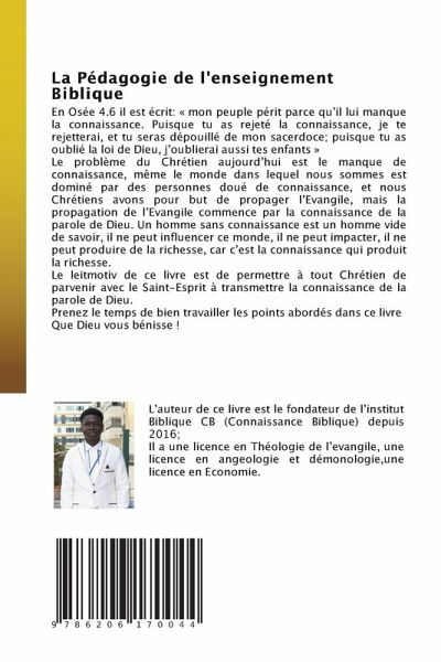 En Osée 4.6 il est écrit: « mon peuple périt parce qu'il lui manque la connaissance. Puisque tu as rejeté la connaissance, je te rejetterai, et tu seras dépouillé de mon sacerdoce; puisque tu as oublié la loi de Dieu, j'oublierai aussi tes enfants »Le problème du Chrétien aujourd'hui est le manque de connaissance, même le monde dans lequel nous sommes est dominé par des personnes doué de connaissance, et nous Chrétiens avons pour but de propager l'Evangile, mais la propagation de l'Evangile commence par la connaissance de la parole de Dieu. Un homme sans connaissance est un homme vide de savoir, il ne peut influencer ce monde, il ne peut impacter, il ne peut produire de la richesse, car c'est la connaissance qui produit la richesse.Le leitmotiv de ce livre est de permettre à tout Chrétien de parvenir avec le Saint-Esprit à transmettre la connaissance de la parole de Dieu.Prenez le temps de bien travailler les points abordés dans ce livre Que Dieu vous bénisse !