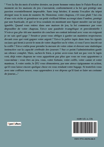 " Vers la fin du mois d¿octobre dernier, un jeune homme entra dans le Palais-Royal au moment où les maisons de jeu s¿ouvraient, conformément à la loi qui protège une passion essentiellement imposable. Sans trop hésiter, il monta l¿escalier du tripot désigné sous le nom de numéro 36. Monsieur, votre chapeau, s¿il vous plaît ? lui cria d¿une voix sèche et grondeuse un petit vieillard blême accroupi dans l¿ombre, protégé par une barricade, et qui se leva soudain en montrant une figure moulée sur un type ignoble. Quand vous entrez dans une maison de jeu, la loi commence par vous dépouiller de votre chapeau. Est-ce une parabole évangélique et providentielle ! N¿est-ce pas plu- tôt une manière de conclure un contrat infernal avec vous en exigeant je ne sais quel gage ? Serait-ce pour vous obliger à garder un maintien respectueux devant ceux qui vont gagner votre argent ? Est-ce la police tapie dans tous les égouts sociaux qui tient à savoir le nom de votre chapelier ou le vôtre, si vous l¿avez inscrit sur la coiffe ? Est-ce enfin pour prendre la mesure de votre crâne et dresser une statistique instructive sur la capacité cérébrale des joueurs ? Sur ce point l¿administration garde un silence complet. Mais, sachez-le bien, à peine avez-vous fait un pas vers le tapis vert, déjà votre chapeau ne vous appartient pas plus que vous ne vous appartenez à vous-même : vous êtes au jeu, vous, votre fortune, votre coiffe, votre canne et votre manteau. À votre sortie, le JEU vous démontrera, par une atroce épigramme en action, qüil vous laisse encore quelque chose en vous rendant votre bagage. Si toutefois vous avez une coiffure neuve, vous apprendrez à vos dépens qüil faut se faire un costume de joueur...."