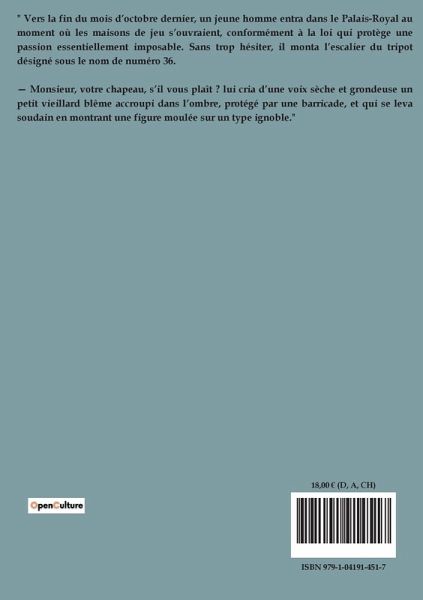 " Vers la fin du mois d¿octobre dernier, un jeune homme entra dans le Palais-Royal au moment où les maisons de jeu s¿ouvraient, conformément à la loi qui protège une passion essentiellement imposable. Sans trop hésiter, il monta l¿escalier du tripot désigné sous le nom de numéro 36. ¿ Monsieur, votre chapeau, s¿il vous plaît ? lui cria d¿une voix sèche et grondeuse un petit vieillard blême accroupi dans l¿ombre, protégé par une barricade, et qui se leva soudain en montrant une figure moulée sur un type ignoble."