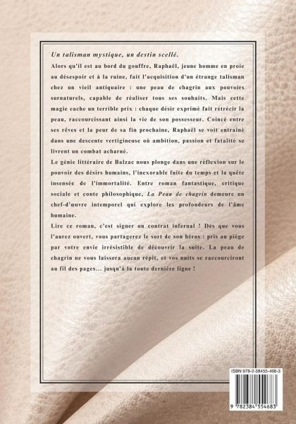 Un talisman mystique, un destin scellé.Alors qu'il est au bord du gouffre, Raphaël, jeune homme en proie au désespoir et à la ruine, fait l'acquisition d'un étrange talisman chez un vieil antiquaire : une peau de chagrin aux pouvoirs surnaturels, capable de réaliser tous ses souhaits. Mais cette magie cache un terrible prix : chaque désir exprimé fait rétrécir la peau, raccourcissant ainsi la vie de son possesseur. Coincé entre ses rêves et la peur de sa fin prochaine, Raphaël se voit entraîné dans une descente vertigineuse où ambition, passion et fatalité se livrent un combat acharné.Le génie littéraire de Balzac nous plonge dans une réflexion sur le pouvoir des désirs humains, l'inexorable fuite du temps et la quête insensée de l'immortalité. Entre roman fantastique, critique sociale et conte philosophique, La Peau de chagrin demeure un chef-d'¿uvre intemporel qui explore les profondeurs de l'âme humaine.Lire ce roman, c'est signer un contrat infernal ! Dès que vous l'aurez ouvert, vous partagerez le sort de son héros : pris au piège par votre envie irrésistible de découvrir la suite. La peau de chagrin ne vous laissera aucun répit, et vos nuits se raccourciront au fil des pages... jusqu'à la toute dernière ligne !
