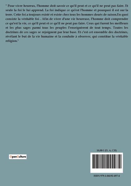 " Pour vivre heureux, l'homme doit savoir ce qu'il peut et ce qu'il ne peut pas faire. Et seule la foi le lui apprend. La foi indique ce qu'est l'homme et pourquoi il est sur la terre. Cette foi a toujours existé et existe chez tous les hommes doués de raison.En quoi consiste la véritable foi . Afin de vivre d'une vie heureuse, l'homme doit comprendre ce qu'est la vie, ce qu'il peut et ce qu'il ne peut pas faire. Ceux qui furent les meilleurs et les plus sages parmi tous les peuples l'enseignèrent de tout temps. Toutes les doctrines de ces sages se rejoignent par leur base. Et c'est cet ensemble des doctrines, révélant le but de la vie humaine et la conduite à observer, qui constitue la véritable religion."