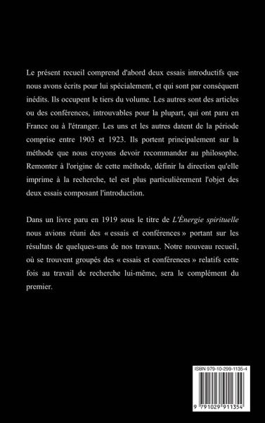 Le présent recueil comprend d'abord deux essais introductifs que nous avons écrits pour lui spécialement, et qui sont par conséquent inédits. Ils occupent le tiers du volume. Les autres sont des articles ou des conférences, introuvables pour la plupart, qui ont paru en France ou à l'étranger. Les uns et les autres datent de la période comprise entre 1903 et 1923. Ils portent principalement sur la méthode que nous croyons devoir recommander au philosophe. Remonter à l'origine de cette méthode, définir la direction qu'elle imprime à la recherche, tel est plus particulièrement l'objet des deux essais composant l'introduction. Dans un livre paru en 1919 sous le titre de L'Énergie spirituelle nous avions réuni des essais et conférences portant sur les résultats de quelques-uns de nos travaux. Notre nouveau recueil, où se trouvent groupés des essais et conférences relatifs cette fois au travail de recherche lui-même, sera le complément du premier.