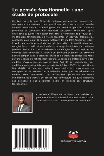 Ce livre présente une étude de protocole qui examine comment les concepteurs construisent des graphiques de structure fonctionnelle lorsqu'ils comprennent et développent des solutions pour de nouveaux problèmes de conception. Huit ingénieurs concepteurs volontaires, ayant entre deux et quatre ans d'expérience dans la conception de produits et la modélisation fonctionnelle, se voient présenter un nouveau problème de conception pour lequel ils doivent développer des modèles fonctionnels dans le cadre du développement du concept. Les actions de modélisation sont enregistrées sur vidéo et les données sont analysées à l'aide d'un protocole prédéfini. Les actions de modélisation sont enregistrées sur vidéo et les données sont analysées à l'aide d'un protocole prédéfini. Le protocole s'avère complet dans le cadre de l'étude et le schéma de codage est validé par une analyse de fiabilité inter-codeurs. L'analyse du protocole révèle des modèles d'occurrences de pauses dans l'activité de modélisation, des modèles élémentaires tels que le texte bord à bord (E-ET), le texte bloc à bloc (B-BT) qui pourraient aider à comprendre le comportement du concepteur et les activités de modélisation telles que l'enchaînement du modèle. Dans l'ensemble, ces observations permettent de mieux comprendre les schémas de pensée des concepteurs lorsqu'ils cherchent des solutions à des problèmes inédits en utilisant des structures fonctionnelles.