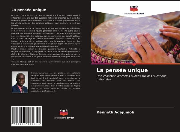 Le livre, "The solo Thought", est un recueil d'articles de l'auteur écrits à différentes occasions sur des questions nationales brûlantes au Nigeria. Les collections portent essentiellement sur l'appel à la bonne gouvernance et sur les efforts délibérés des échelons politiques pour améliorer le sort des masses. Le tout premier article de l'auteur qui a fait son entrée dans les publications de haut niveau est intitulé "Quelle génération timide". Il a été publié pour la première fois en dernière page du Guardian du 22 mai 2015. L'article présente une vue d'ensemble des nationaux qui ont commencé leur activité politique dans la fleur de l'âge et, jusqu'à récemment, plusieurs d'entre eux sont toujours à la tête de la politique alors que la population jeune est loin d'occuper le siège de la gouvernance. Il s'agit d'un appel à la jeunesse pour qu'elle participe activement à la politique de la nation. D'autres articles traitent de diverses questions touchant à l'ethnicité, la religion, la corruption, la négligence du devoir dans la fonction publique et la chaîne de valeur des hôpitaux. D'autres encore partagent leur point de vue sur l'insécurité croissante et la guerre mondiale médicale provoquée par COVID-19. The Solo Thought est un livre que vous apprécierez et que vous partagerez avec vos amis pour le lire.