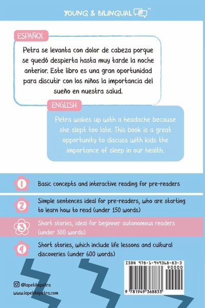 Petra wakes up with a headache because she slept too late. This book is a great opportunity to discuss with kids the importance of sleep in our health. Petra se despierta con dolor de cabeza porque durmió demasiado tarde. Este libro es una gran oportunidad para discutir con los niños la importancia del sueño en nuestra salud.