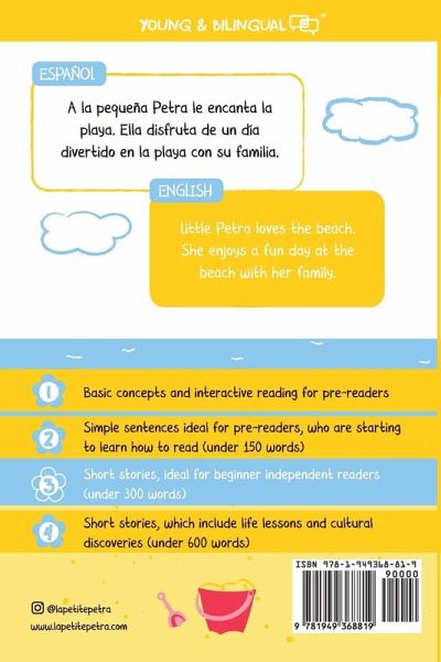 Little Petra loves the beach. She enjoys a fun day at the beach with her family. This book is a part of the bilingual book series for children entitled "La Petite Pétra". It is a bilingual book, written in both French and English. It is a Level 3 reading book as defined on the back cover of the book. Level 3 books in this series are defined as short stories (under 300 words) that are ideal for beginner autonomous readers. A la pequeña Petra le encanta la playa. Ella disfruta de un día divertido en la playa con su familia. Este libro es parte de la serie de libros bilingües para niños titulada "La Petite Pétra". Es un libro bilingüe, escrito en francés e inglés. Es un libro de lectura de Nivel 3 como se define en la contraportada del libro. Los libros de nivel 3 de esta serie se definen como cuentos (menos de 300 palabras) que son ideales para lectores autónomos principiantes.