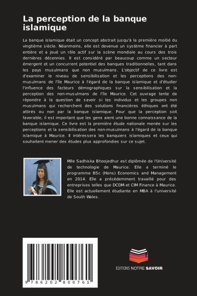 La banque islamique était un concept abstrait jusqu'à la première moitié du vingtième siècle. Néanmoins, elle est devenue un système financier à part entière et a joué un rôle actif sur la scène mondiale au cours des trois dernières décennies. Il est considéré par beaucoup comme un secteur émergent et un concurrent potentiel des banques traditionnelles, tant dans les pays musulmans que non musulmans. L'objectif de ce livre est d'examiner le niveau de sensibilisation et les perceptions des non-musulmans de l'île Maurice à l'égard de la banque islamique et d'étudier l'influence des facteurs démographiques sur la sensibilisation et la perception des non-musulmans de l'île Maurice. Cet ouvrage tente de répondre à la question de savoir si les individus et les groupes non musulmans qui recherchent des solutions financières éthiques ont été attirés ou non par la banque islamique. Pour que la perception soit favorable, il est important que les gens aient une bonne connaissance de la banque islamique. Ce livre est la première étude nationale menée sur les perceptions et la sensibilisation des non-musulmans à l'égard de la banque islamique à Maurice. Il intéressera les banquiers islamiques et ceux qui souhaitent mener des études plus approfondies sur ce sujet.
