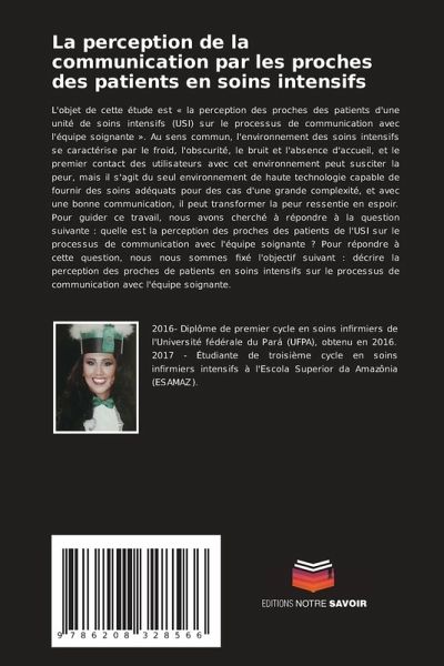 L'objet de cette étude est « la perception des proches des patients d'une unité de soins intensifs (USI) sur le processus de communication avec l'équipe soignante ». Au sens commun, l'environnement des soins intensifs se caractérise par le froid, l'obscurité, le bruit et l'absence d'accueil, et le premier contact des utilisateurs avec cet environnement peut susciter la peur, mais il s'agit du seul environnement de haute technologie capable de fournir des soins adéquats pour des cas d'une grande complexité, et avec une bonne communication, il peut transformer la peur ressentie en espoir. Pour guider ce travail, nous avons cherché à répondre à la question suivante : quelle est la perception des proches des patients de l'USI sur le processus de communication avec l'équipe soignante ? Pour répondre à cette question, nous nous sommes fixé l'objectif suivant : décrire la perception des proches de patients en soins intensifs sur le processus de communication avec l'équipe soignante.