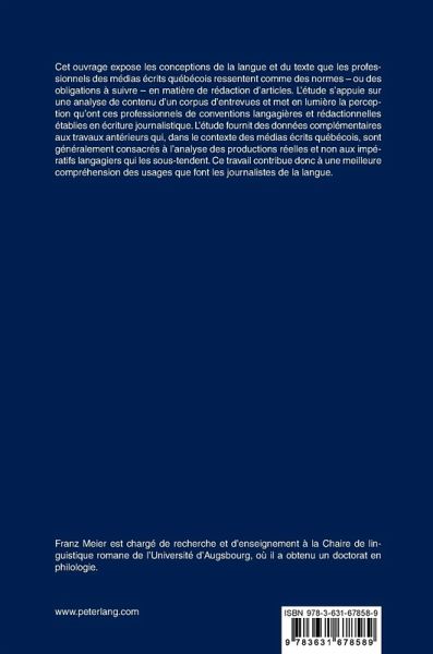 Cet ouvrage expose les conceptions de la langue et du texte que les professionnels des médias écrits québécois ressentent comme des normes - ou des obligations à suivre - en matière de rédaction d'articles. L'étude s'appuie sur une analyse de contenu d'un corpus d'entrevues et met en lumière la perception qu'ont ces professionnels de conventions langagières et rédactionnelles établies en écriture journalistique. L'étude fournit des données complémentaires aux travaux antérieurs qui, dans le contexte des médias écrits québécois, sont généralement consacrés à l'analyse des productions réelles et non aux impératifs langagiers qui les sous-tendent. Ce travail contribue donc à une meilleure compréhension des usages que font les journalistes de la langue.