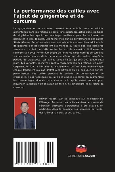 Le gingembre et le curcuma peuvent être utilisés comme additifs alimentaires dans les rations de caille, une substance active dans les types de zingibéracées ayant des avantages meilleurs pour les animaux, en particulier le type de caille. Des recherches sur les performances des cailles Starter-Grower Period nourries avec des aliments commerciaux additionnés de gingembre et de curcuma ont été menées au cours des cinq dernières semaines. Le but de cette recherche est de connaître l'influence de l'alimentation sous forme numérique de farine de gingembre et de curcuma sur les performances de la période de démarrage des cailles jusqu'à la période de croissance. Les cailles sont utilisées jusqu'à 240 queue deux jours. Les variables observées sont la consommation des rations, les poids corporels, le FCR, la mortalité et l'épuisement. Les résultats montrent que chaque traitement n'a pas d'effet réel différent ou n'a pas d'effet sur les performances des cailles pendant la période de démarrage et de croissance. Il est nécessaire de faire des études similaires en augmentant les pourcentages donnés dans chacun, afin qu'ils soient connus pour influencer l'attribution de la ration de farine, de gingembre et de farine de curcuma.