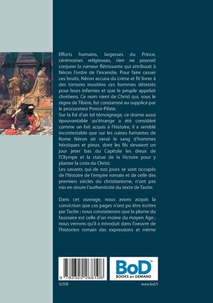 Efforts humains, largesses du Prince, cérémonies religieuses, rien ne pouvait conjurer la rumeur flétrissante qui attribuait à Néron l'ordre de l'incendie. Pour faire cesser ces bruits, Néron accusa du crime et fit livrer à des tortures inusitées ces hommes détestés pour leurs infamies et que le peuple appelait chrétiens. Ce nom vient de Christ qui, sous le règne de Tibère, fut condamné au supplice par le procurateur Ponce-Pilate.Sur la foi d'un tel témoignage, ce drame aussi épouvantable qu'étrange a été considéré comme un fait acquis à l'histoire, il a semblé incontestable que sur les ruines fumantes de Rome Néron ait versé le sang d'hommes héroïques et pieux, dont les fils devaient un jour jeter bas du Capitole les dieux de l'Olympe et la statue de la Victoire pour y planter la croix du Christ.Les savants qui de nos jours se sont occupés de l'histoire de l'empire romain et de celle des premiers siècles du christianisme, n'ont pas mis en doute l'authenticité du texte de Tacite.Dans cet ouvrage, nous avons acquis la conviction que ces pages n'ont pu être écrites par Tacite ; nous constaterons que la plume du faussaire est celle d'un moine du moyen Age ; nous verrons qu'il a introduit dans l'oeuvre de l'historien romain des expressions et même des phrases entières prises dans des auteurs ecclésiastiques ; nous reconnaîtrons, par l'examen des documents historiques, qu'il n'y a pas eu de persécution de chrétiens sous Néron ; nous rechercherons alors comment cette légende s'est formée et quelles ont été les diverses phases de son développement.