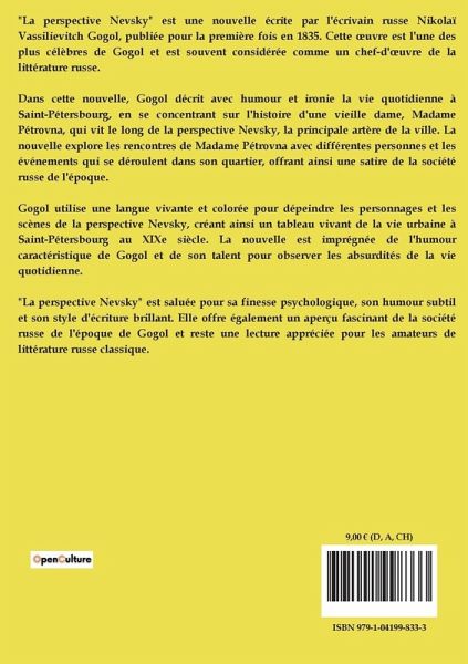 "La perspective Nevsky" est une nouvelle écrite par l'écrivain russe Nikolaï Vassilievitch Gogol, publiée pour la première fois en 1835. Cette ¿uvre est l'une des plus célèbres de Gogol et est souvent considérée comme un chef-d'¿uvre de la littérature russe. Dans cette nouvelle, Gogol décrit avec humour et ironie la vie quotidienne à Saint-Pétersbourg, en se concentrant sur l'histoire d'une vieille dame, Madame Pétrovna, qui vit le long de la perspective Nevsky, la principale artère de la ville. La nouvelle explore les rencontres de Madame Pétrovna avec différentes personnes et les événements qui se déroulent dans son quartier, offrant ainsi une satire de la société russe de l'époque. Gogol utilise une langue vivante et colorée pour dépeindre les personnages et les scènes de la perspective Nevsky, créant ainsi un tableau vivant de la vie urbaine à Saint-Pétersbourg au XIXe siècle. La nouvelle est imprégnée de l'humour caractéristique de Gogol et de son talent pour observer les absurdités de la vie quotidienne. "La perspective Nevsky" est saluée pour sa finesse psychologique, son humour subtil et son style d'écriture brillant. Elle offre également un aperçu fascinant de la société russe de l'époque de Gogol et reste une lecture appréciée pour les amateurs de littérature russe classique.