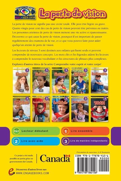 La perte de vision ne signifie pas une cécité totale. Elle peut être légère ou grave. Quatre-vingts pour cent des cas de perte de vision peuvent être prévenus ou traités. Les personnes atteintes de perte de vision mènent une vie active et épanouissante. Découvrez ce qui cause la perte de vision, pourquoi il est important de passer régulièrement des examens de la vue, et ce que vous pouvez faire pour aider quelqu'un atteint de perte de vision. Les lecteurs de niveau 3 sont destinés aux enfants qui lisent seuls et peuvent comprendre de nouveaux concepts. Les mots clés et les légendes aident les lecteurs à comprendre le nouveau vocabulaire et les structures de phrases plus complexes. Ce projet a été rendu possible en partie grâce au gouvernement du Canada.