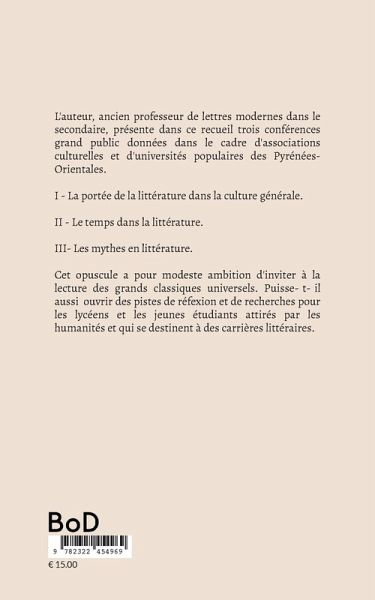 L'auteur, ancien professeur de lettres modernes dans le secondaire, présente dans ce recueil trois conférences grand public données dans le cadre d'associations culturelles et d'universités populaires des Pyrénées-Orientales.I - La portée de la littérature dans la culture générale.II - Le temps dans la littérature.III- Les mythes en littérature.Cet opuscule a pour modeste ambition d'inviter à la lecture des grands classiques universels. Puisse-t-il aussi ouvrir des pistes de réfexion et de recherches pour les lycéens et les jeunes étudiants attirés par les humanités et qui se destinent à des carrières littéraires.
