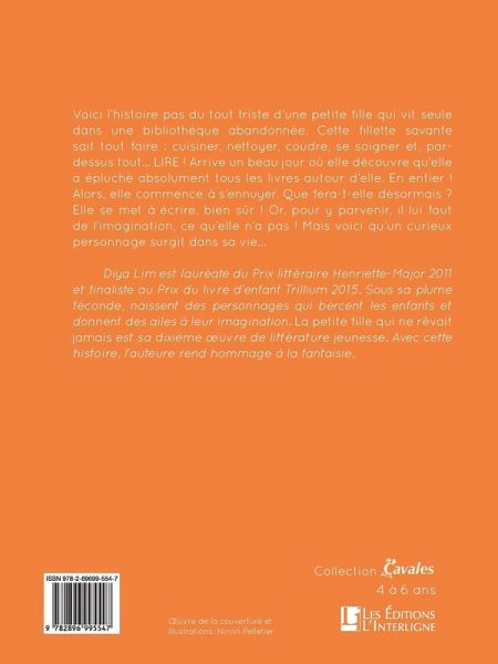 Voici l'histoire pas du tout triste d'une petite fille qui vit seule dans une bibliothèque abandonnée. Cette fillette savante sait tout faire : cuisiner, nettoyer, coudre, se soigner et, par-dessus tout... LIRE ! Arrive un beau jour où elle découvre qu'elle a épluché absolument tous les livres autour d'elle. En entier! Alors, elle commence à s'ennuyer. Que fera-t-elle désormais? Elle se met à écrire, bien sûr ! Or, pour y parvenir, il lui faut de l'imagination, ce qu'elle n'a pas ! Mais voici qu'un curieux personnage surgit dans sa vie...