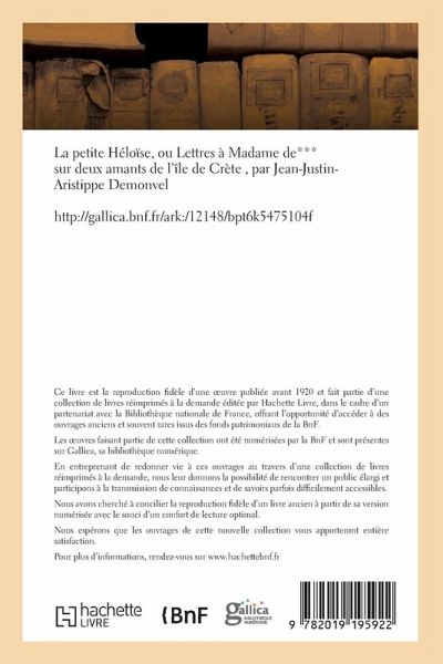 La petite Héloïse, ou Lettres à Madame de*** sur deux amants de l'île de Crète, par Jean-Justin-Aristippe Demonvel Date de l'édition originale: 1814 Le présent ouvrage s'inscrit dans une politique de conservation patrimoniale des ouvrages de la littérature Française mise en place avec la BNF. HACHETTE LIVRE et la BNF proposent ainsi un catalogue de titres indisponibles, la BNF ayant numérisé ces oeuvres et HACHETTE LIVRE les imprimant à la demande. Certains de ces ouvrages reflètent des courants de pensée caractéristiques de leur époque, mais qui seraient aujourd'hui jugés condamnables. Ils n'en appartiennent pas moins à l'histoire des idées en France et sont susceptibles de présenter un intérêt scientifique ou historique. Le sens de notre démarche éditoriale consiste ainsi à permettre l'accès à ces oeuvres sans pour autant que nous en cautionnions en aucune façon le contenu. Pour plus d'informations, rendez-vous sur www.hachettebnf.fr