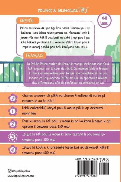 In this story, La Petite Pétra gets teased at school and goes home very sad. Her Mom helps her find the strength within herself to build character and not let the teasing affect her. She teaches her how to repeat positive affirmations to build her self-confidence. Bullying starts with teasing! That is why we must help our children build inner strength. This is a bilingual book. This version is in French and Haitian Creole.
