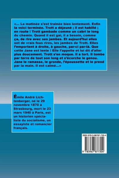 ... La matinée s'est traînée bien lentement. Enfin la voici terminée. Trott a déjeuné ; il est habillé ; en route ! Trott gambade comme un cabri le long du chemin. Quand il est gai, il a besoin, comme ça, de rire avec ses jambes. Et aujourd'hui elles ont de vrais fous rires, les jambes de Trott. Elles l'emportent à droite, à gauche, par-ci par-là. Que cette Jane est lente ! Elle l'appelle et lui dit d'aller plus doucement. Trott s'en moque. Il a tort. Il tombe par terre de tout son long et s'écorche le genou. Jane le ramasse, le gronde, l'époussette et le prend par la main. Il est calmé...