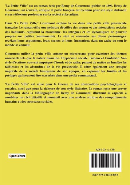 "La Petite Ville" est un roman écrit par Remy de Gourmont, publié en 1893. Remy de Gourmont, un écrivain, critique et poète français, est reconnu pour son style distinctif et ses réflexions profondes sur la société et la culture. Dans "La Petite Ville," Gourmont explore la vie dans une petite ville provinciale française. Le roman offre une peinture détaillée des m¿urs et des interactions sociales des habitants, capturant la monotonie, les intrigues et les dynamiques de pouvoir propres aux petites communautés. Le récit se concentre sur divers personnages, révélant leurs aspirations, leurs secrets et leurs frustrations dans un cadre où tout le monde se connaît. Gourmont utilise la petite ville comme un microcosme pour examiner des thèmes universels tels que la nature humaine, l'hypocrisie sociale, l'amour et l'ambition. Son style d'écriture, souvent imprégné d'ironie et de satire, permet de mettre en lumière les faiblesses et les absurdités de la vie provinciale. Il offre également une critique implicite de la société bourgeoise de son époque, en exposant les limites et les préjugés qui peuvent être exacerbés dans une petite communauté. "La Petite Ville" est salué pour la finesse de ses observations psychologiques et sociales, ainsi que pour la richesse de son style littéraire. Le roman reste une ¿uvre importante dans la bibliographie de Remy de Gourmont, illustrant sa capacité à combiner un récit détaillé et immersif avec une analyse critique des comportements humains et des structures sociales.