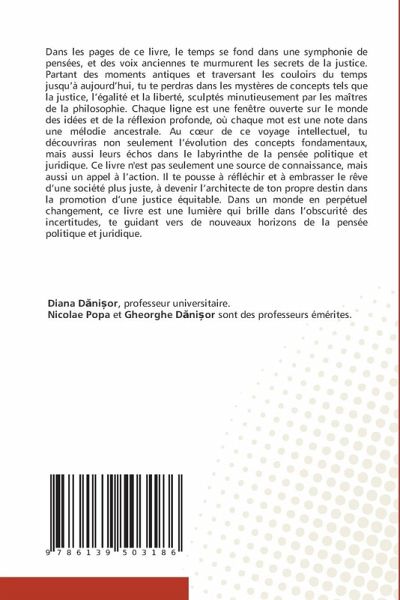 Dans les pages de ce livre, le temps se fond dans une symphonie de pensées, et des voix anciennes te murmurent les secrets de la justice. Partant des moments antiques et traversant les couloirs du temps jusqu'à aujourd'hui, tu te perdras dans les mystères de concepts tels que la justice, l'égalité et la liberté, sculptés minutieusement par les maîtres de la philosophie. Chaque ligne est une fenêtre ouverte sur le monde des idées et de la réflexion profonde, où chaque mot est une note dans une mélodie ancestrale. Au coeur de ce voyage intellectuel, tu découvriras non seulement l'évolution des concepts fondamentaux, mais aussi leurs échos dans le labyrinthe de la pensée politique et juridique. Ce livre n'est pas seulement une source de connaissance, mais aussi un appel à l'action. Il te pousse à réfléchir et à embrasser le rêve d'une société plus juste, à devenir l'architecte de ton propre destin dans la promotion d'une justice équitable. Dans un monde en perpétuel changement, ce livre est une lumière qui brille dans l'obscurité des incertitudes, te guidant vers de nouveaux horizons de la pensée politique et juridique.