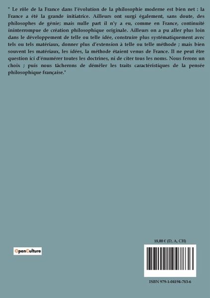 " Le rôle de la France dans l¿évolution de la philosophie moderne est bien net : la France a été la grande initiatrice. Ailleurs ont surgi également, sans doute, des philosophes de génie; mais nulle part il n¿y a eu, comme en France, continuité ininterrompue de création philosophique originale. Ailleurs on a pu aller plus loin dans le développement de telle ou telle idée, construire plus systématiquement avec tels ou tels matériaux, donner plus d¿extension à telle ou telle méthode ; mais bien souvent les matériaux, les idées, la méthode étaient venus de France. Il ne peut être question ici d¿énumérer toutes les doctrines, ni de citer tous les noms. Nous ferons un choix ; puis nous tâcherons de démêler les traits caractéristiques de la pensée philosophique française."