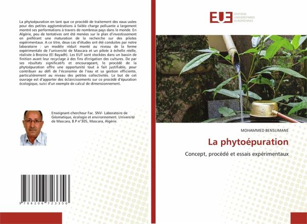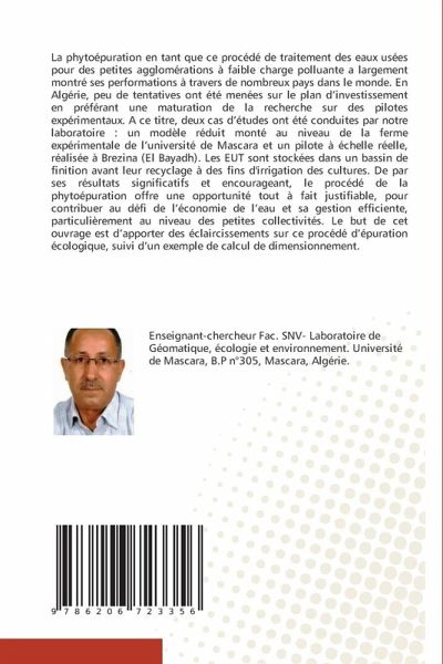 La phytoépuration en tant que ce procédé de traitement des eaux usées pour des petites agglomérations à faible charge polluante a largement montré ses performations à travers de nombreux pays dans le monde. En Algérie, peu de tentatives ont été menées sur le plan d'investissement en préférant une maturation de la recherche sur des pilotes expérimentaux. A ce titre, deux cas d'études ont été conduites par notre laboratoire : un modèle réduit monté au niveau de la ferme expérimentale de l'université de Mascara et un pilote à échelle réelle, réalisée à Brezina (El Bayadh). Les EUT sont stockées dans un bassin de finition avant leur recyclage à des fins d'irrigation des cultures. De par ses résultats significatifs et encourageant, le procédé de la phytoépuration offre une opportunité tout à fait justifiable, pour contribuer au défi de l'économie de l'eau et sa gestion efficiente, particulièrement au niveau des petites collectivités. Le but de cet ouvrage est d'apporter des éclaircissements sur ce procédé d'épuration écologique, suivi d'un exemple de calcul de dimensionnement.