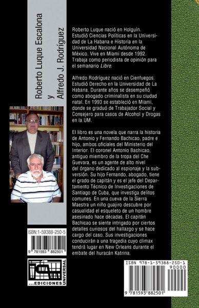 This book is a novel that tells the story of Antonio and Fernando Bachicao, father and son, both officers of the Ministry of the Interior. Colonel Antonio Bachicao, former member of Che Guevara's troop, is a high-level agent of the section specializing in espionage and subversion. His son Fernando, a lawyer, has the rank of captain and is the head of the Department of Technical Investigations in Santiago de Cuba, which investigates common crimes. In a cave of the Sierra Maestra, a farmer's child discovers by chance the decade old skeleton of a murdered man. Captain Bachicao is intrigued by certain interesting details of the discovery and is in charge of the case. Their research will lead to a tragedy whose climax will take place in New Orleans during the onsslaugh of Hurricane Katrina.