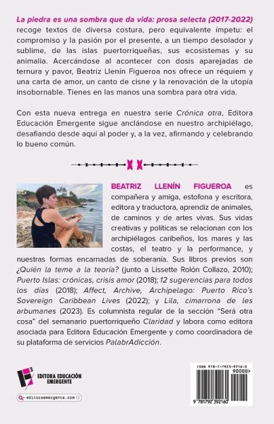 La piedra es una sombra que da vida: prosa selecta (2017-2022) recoge textos de diversa costura, pero equivalente ímpetu: el compromiso y la pasión por el presente, a un tiempo desolador y sublime, de las islas puertorriqueñas, sus ecosistemas y su animalia. Acercándose al acontecer con dosis aparejadas de ternura y pavor, Beatriz Llenín Figueroa nos ofrece un réquiem y una carta de amor, un canto de cisne y la renovación de la utopía insobornable. Tienes en las manos una sombra para otra vida. Con esta nueva entrega en nuestra serie Crónica otra, Editora Educación Emergente sigue anclándose en nuestro archipiélago, desafiando desde aquí al poder y, a la vez, afirmando y celebrando lo bueno común.