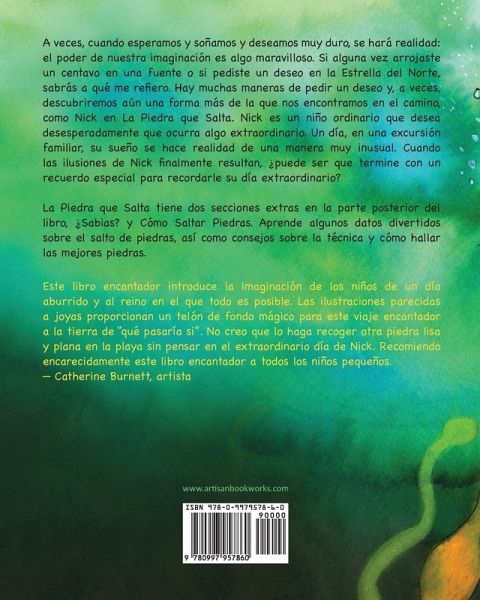 A veces, cuando esperamos y soñamos y deseamos muy duro, se hará realidad: el poder de nuestra imaginación es algo maravilloso. Si alguna vez arrojaste un centavo en una fuente o si pediste un deseo en la Estrella del Norte, sabrás a qué me refiero. Hay muchas maneras de pedir un deseo y, a veces, descubriremos aún una forma más de la que nos encontramos en el camino, como Nick en La Piedra que Salta. Nick es un niño ordinario que desea desesperadamente que ocurra algo extraordinario. Un día, en una excursión familiar, su sueño se hace realidad de una manera muy inusual. Cuando las ilusiones de Nick finalmente resultan, ¿puede ser que termine con un recuerdo especial para recordarle su día extraordinario? La Piedra que Salta tiene dos secciones extras en la parte posterior del libro, ¿Sabias? y Cómo Saltar Piedras. Aprende algunos datos divertidos sobre el salto de piedras, así como consejos sobre la técnica y cómo hallar las mejores piedras.