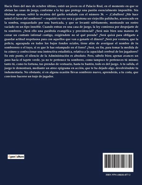 Hacia fines del mes de octubre último, entró un joven en el Palacio Real, en el momento en que se abrían las casas de juego, conforme a la ley que protege una pasión esencialmente imponible. Sin titubear apenas, subió la escalera del garito señalado con el número 36. ¿ ¡Caballero! ¿Me hace usted el favor del sombrero? ¿requirió en voz seca y gruñona un viejecillo paliducho, acurrucado en la sombra, resguardado por una barricada, y que se levantó súbitamente, mostrando un rostro vaciado en un tipo innoble. Cuando entras en una casa de juego, la ley comienza por despojarte de tu sombrero. ¿Será ello una parábola evangélica y providencial? ¿Será más bien una manera de cerrar un contrato infernal contigo, exigiéndote no sé qué prenda? ¿Será quizá para obligarte a guardar actitud respetuosa para con aquellos que van a ganarte el dinero? ¿Será por ventura, que la policía, agazapada en todos los bajos fondos ociales, tiene afán de averiguar el nombre de tu sombrerero o el tuyo, si es que le has estampado en el forro? ¿Será, en fin, para tomar la medida de tu cráneo y confeccionar una instructiva estadística, relativa a la capacidad cerebral de los jugadores? En este punto, el silencio de la Administración es absoluto. Pero, sábelo bien; apenas avances un paso hacia el tapete verde, ya no te pertenece tu sombrero, como tampoco te perteneces tú mismo; tanto tú, como tu fortuna, tus prendas de vestuario, hasta tu bastón, todo es del juego. A tu salida, el juego te demostrará, mediante un atroz epigrama en acción, que te ha dejado algo, devolviéndote tu indumentaria. No obstante, si en alguna ocasión llevas sombrero nuevo, aprenderás, a tu costa, que conviene hacerse un traje de jugador.