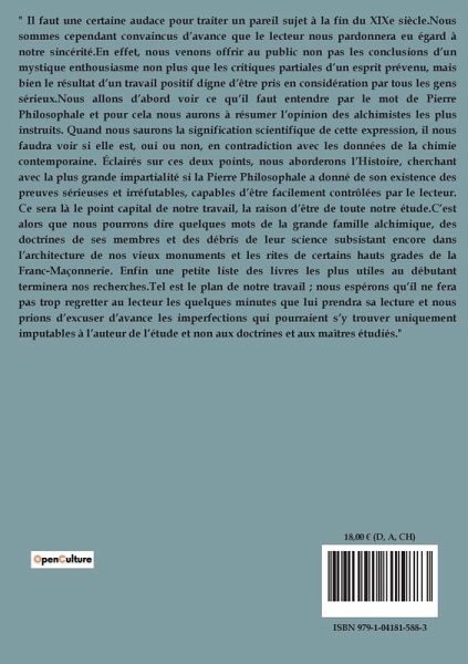 " Il faut une certaine audace pour traiter un pareil sujet à la fin du XIXe siècle.Nous sommes cependant convaincus d¿avance que le lecteur nous pardonnera eu égard à notre sincérité.En effet, nous venons offrir au public non pas les conclusions d¿un mystique enthousiasme non plus que les critiques partiales d¿un esprit prévenu, mais bien le résultat d¿un travail positif digne d¿être pris en considération par tous les gens sérieux.Nous allons d¿abord voir ce qüil faut entendre par le mot de Pierre Philosophale et pour cela nous aurons à résumer l¿opinion des alchimistes les plus instruits. Quand nous saurons la signification scientifique de cette expression, il nous faudra voir si elle est, oui ou non, en contradiction avec les données de la chimie contemporaine. Éclairés sur ces deux points, nous aborderons l¿Histoire, cherchant avec la plus grande impartialité si la Pierre Philosophale a donné de son existence des preuves sérieuses et irréfutables, capables d¿être facilement contrôlées par le lecteur. Ce sera là le point capital de notre travail, la raison d¿être de toute notre étude.C¿est alors que nous pourrons dire quelques mots de la grande famille alchimique, des doctrines de ses membres et des débris de leur science subsistant encore dans l¿architecture de nos vieux monuments et les rites de certains hauts grades de la Franc-Maçonnerie. Enfin une petite liste des livres les plus utiles au débutant terminera nos recherches.Tel est le plan de notre travail ; nous espérons qüil ne fera pas trop regretter au lecteur les quelques minutes que lui prendra sa lecture et nous prions d¿excuser d¿avance les imperfections qui pourraient s¿y trouver uniquement imputables à l¿auteur de l¿étude et non aux doctrines et aux maîtres étudiés."