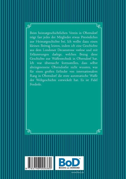 Beim heimatgeschichtlichen Verein in Oberndorf trägt fast jedes der Mitglieder etwas Persönliches zur Heimatgeschichte bei. Ich wollte dazu einen kleinen Beitrag leisten, indem ich eine Geschichte aus dem Londoner Decamerone vorlese und mit Erläuterungen darlege, welchen Bezug diese Geschichte zur Waffentechnik in Oberndorf hat. Ich war überrascht festzustellen, dass selbst alteingesessene Oberndorfer nicht wussten, was für einen großen Erfinder von internationalem Rang in Oberndorf die erste automatische Waffe der Weltgeschichte entwickelt hat. Es ist Fidel Feederle.